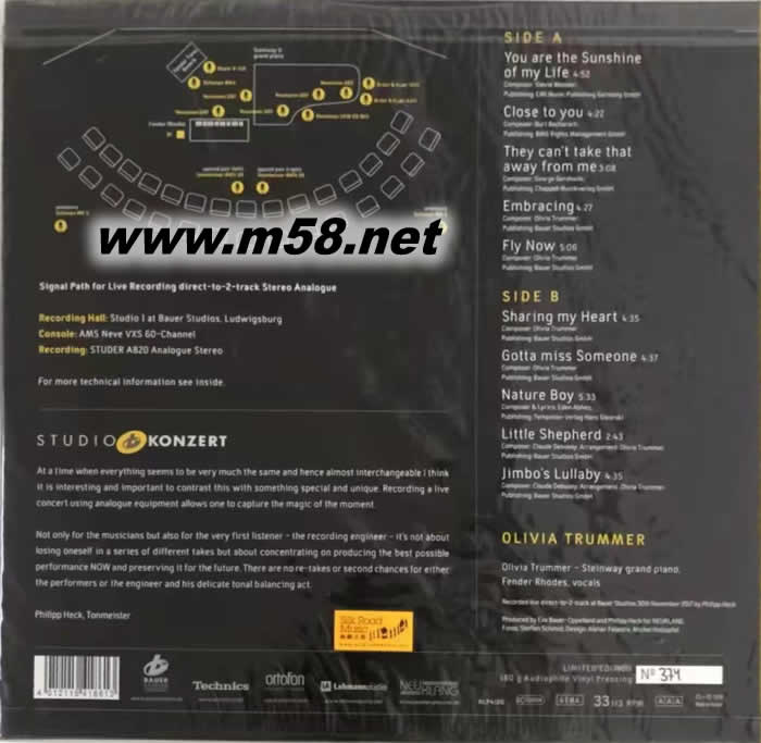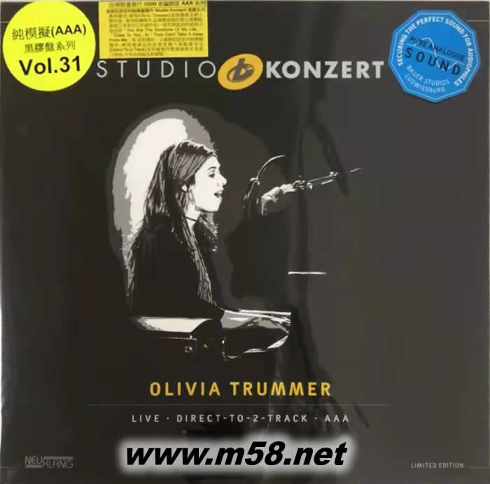 純仿真制作—奧利維亞 頌瑪 Studio Koncert (AAA Series) : Olivia Trummer 爵士 黑膠(m58.net) 接近原音的純模擬製作—Studio Konzert黑膠系列 由現(xiàn)場錄音,直接入兩軌模擬錄音臺(Direct-To-2-Track)至母盤制作整個過程全是模擬制作(AAA) 全球限量發(fā)行1000套編號版 1. 奧利維亞.頌瑪(Olivia Trummer)是德國斯圖加特(Stuttgart)著名爵士樂作曲、歌唱和鋼琴手,肄業(yè)於[斯圖加特音樂大學(xué)(University of Music in Stuttgart)],曾獲得到多個音樂獎項,於2014年被邀在英國著名的[倫敦爵士音樂節(jié)(London Jazz Festival)]演出,演出備受樂迷擊節(jié)讚賞,從而奠定她在歐洲爵士樂壇崇高地位。 2. 頌瑪年紀(jì)雖輕但多才多藝,擁有清澈明亮的聲線,加上其深厚的音樂根基,她對樂曲的精心編排融合其熟練和多元化的技巧,使她更能全面發(fā)揮每首演繹歌曲的特質(zhì),尤其是爵士樂現(xiàn)場即興的演出,更是如魚得水,相得益彰。 3. 頌瑪?shù)牡谄邚垖]嬍乾F(xiàn)場實況演出的純模擬黑膠盤(AAA series)製作,演出的音樂人需擁有高水平的演唱或演奏技巧,豐富的演出經(jīng)驗,最重要是不可或缺的信心,因為此種製作是將演出一氣呵成地紀(jì)錄,接連地不會停止或再試,頌瑪完全具備這些條件,她在這專輯完全展示她這些過人的特質(zhì)。 4. 頌瑪演唱了多首自己的創(chuàng)作和一些耳熟能詳?shù)慕?jīng)典名曲包括「You Are The Sunshine Of My Life(你是我生命中的陽光)」、「Close To You(親近你)」和「They Can't Take It Away From Me(你不能從我手中取走它)」等,首首精彩。 5. 以最接近原音的純模擬製作,將現(xiàn)場演出的拾音直接入兩軌錄音臺(Direct-To-2-Track)至母盤製作整個過程全是原汁原味,不作任何修改和調(diào)整,絕對是最傳真的(AAA) 製作,加上全球限量發(fā)行1000套編號版,更屬珍貴。