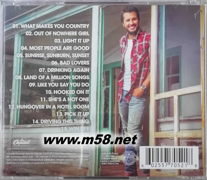 本名Thomas Luther Bryan的Luke Bryan,出生於1976年的喬治亞州,並在2006年時正式踏入樂壇、12年來,他總計獲得了9座American Country Awards大獎、4座Academy of Country Music Awards大獎、6座CMT Music Awards大獎,以及其他獎項約40座,而他歷年來的專輯與單曲銷售,合計超過了3400萬張以上,YouTube的點閱率也來到接近「10億次」,可說是當代音鄉村音樂中的天王級人物。睽違了2年的時間,Luke Bryan再次投注全副心血,以鄉村音樂結合些許搖滾元素,交出了全新第六張專輯【What Makes You Country】,並一口氣登上告示牌主流榜與鄉村榜雙料冠軍。