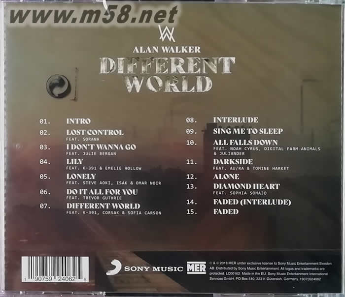 1. Intro 2. Lost Control feat. Sorana 失控 3. I Don't Wanna Go feat. Julie Bergan 不捨離去 4. Lily feat. K-391 & Emelie Hollow 莉莉 5. Lonely feat. Steve Aoki, Isák & Omar Noir 孤單寂寞 6. Do It All For You feat. Trevor Guthrie 只為你 7. Different World feat. K-391, Corsak & Sofia Carson 理想世界 8. Interlude 9. Sing Me To Sleep (*18白金) 唱首歌伴我入眠 10. All Falls Down feat. Noah Cyrus, Digital Farm Animals & Juliander (*6白金) 全面崩壞 11. Darkside feat. Au/Ra & Tomine Harket (*白金) 暗黑之境 12. Alone (*13白金) 不孤單 13. Diamond Heart feat. Sophia Somajo 鉆石心 14. Faded (Interlude) 15. Faded (*43白金) 人間迷走