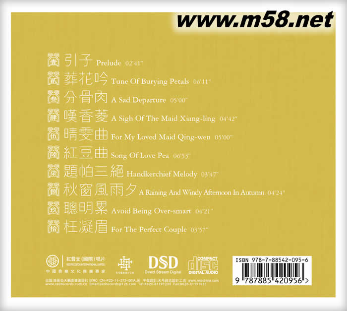 01 Prelude 引 子 02:41 02 Tune Of Burying Petals 葬花吟 06:11 03 A Sad Departure 分骨肉 05:00 04 A Sigh Of The Maid Xiang-ling 嘆香菱 04:42 05 For My Loved Maid Qing-wen 晴雯曲 05:00 06 Song Of Love Pea 紅豆曲 06:53 07 Handkerchief Melody 題帕三絕 03:47 08 A Raining And Windy Aftremon ln Autumn 秋窗風雨夕 04:24 09 Avoid Being Over-smart 聰明累 04:21 10 For The Perfect Couple 枉凝眉 03:57