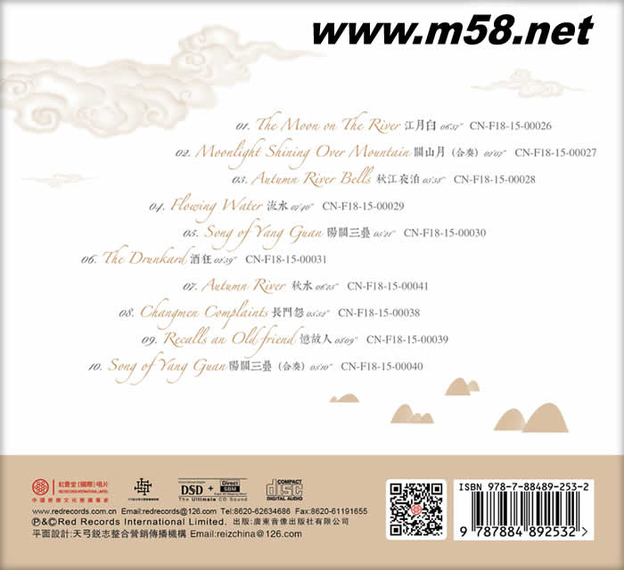 01 江月白 The moon on the river ISRC CN-F18-15-00026 6:37 02 關山月(合奏) Moonlight Shining Over Mountain ISRC CN-F18-15-00027 2:07 03 秋江夜泊 Autumn River Bells ISRC CN-F18-15-00028 3:38 04 流水 Flowing Water ISRC CN-F18-15-00029 7:40 05 陽關三疊 Song of Yang Guan ISRC CN-F18-15-00030 05:21 06 酒狂 The drunkard ISRC CN-F18-15-00031 02:39 07 秋水 Autumn River ISRC CN-F18-15-00041 06:25 08 長門怨 Changmen complaints ISRC CN-F18-15-00038 05:52 09 憶故人 Recalls an old friend ISRC CN-F18-15-00039 08:09 10 陽關三疊(合奏) Song of Yang Guan ISRC CN-F18-15-00040 05:10