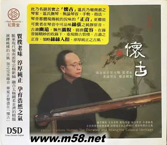 此乃名副其實之『懷古』區氏乃嶺南派之琴家,區氏撫琴,無論琴容、手勢、指法、琴音都體現傳統的況味的『正音』更難能可貴者在琴音中可品味絲弦之純靜原音。古澹幽遠,飄然灑脫,圓潤從容,在錄音師精妙的收錄下,重現簡古質樸,古澹之正音,領略絲絲入扣、淳厚純正之古風。