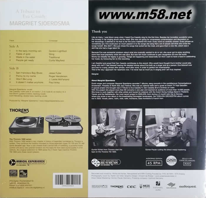 紀念伊娃 卡西迪 MARGRIET SJOERDSMA 演唱EVA民謠 45轉(zhuǎn) 黑膠(m58.net) STS推出的一張為紀念Eva Cassidy而錄制的黑膠,荷蘭女歌手Margriet Sjoerdsma與負責低音的Cord Heineking默契配合錄制了一張發(fā)燒人聲。DMM金屬直刻母版壓片,劉漢盛總編特別推薦