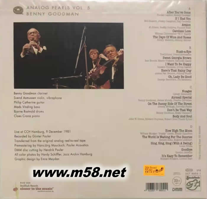 模擬的魅力「黑珍珠」系列第五輯[1981年德國漢堡演奏 會現場實況錄音] Analog Pearls Vol. 5 Benny Goodman:[Live in Hamburg 1981] 黑膠(m58.net) Benny Goodman (單簧管) Svend Asmussen (小提琴及顫音琴) Philip Catherine (結他) Mads Vinding (低音結他) Bjame Rostvold (鼓) Claes Crona (鋼琴) 音響論壇—總編劉漢盛推薦 :Benny Goodman Live in Hamburg 1981
