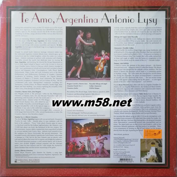 [愛你, 阿根廷]Te Amo, Argentina 爵士三重奏(大提琴、鋼琴、低音吉它) 黑膠(m58.net) Antonio Lysy (大提琴) Bryan Pezzone (鋼琴) Pablo Motta (低音結他) <雅魯唱片(Yarlung Records)>是現今美國新興發燒古典音樂廠牌,由老板兼著名錄音師錄音師鮑勃.阿蒂雅(Bob Attiyeh)負責錄音製作同時亦與史蒂夫.霍夫曼(Steve Hoffman)共同作母盤處理,而黑膠製作則請來著名母盤制作猛人道格.薩克斯(Doug Sax)與桑格伍克.南(Sangwook Nam)操刀,無論音樂與音效皆達致最高水平。國際知名的大提琴大師安東尼歐.李西(Antonio Lysy)的<阿根廷作曲家作品(Antonio Lysy at the Broad:Music from Argentina)>更榮獲「2010年第11屆拉丁格萊美—最佳古典當代音樂獎(Latin Grammy Award—Best Classical Contemporary Composition)」、同時亦入選<音響論壇>總編—劉漢盛「黑膠專書」推介、而資深黑膠達人邁克爾.弗梅爾(Michael Fremer)推許本專輯在音樂、音響性皆給予超越滿分的激賞。得到專業音樂界別一致好評,備受全球矚目。李西的最新錄音,聯同鋼琴家布萊恩.裴通尼(Bryan Pezzone)、低音吉他手保羅‧莫塔(Pablo Motta)與及”首都樂團(Capitol Ensemble)”合力演繹多位阿根廷作曲家的著作,