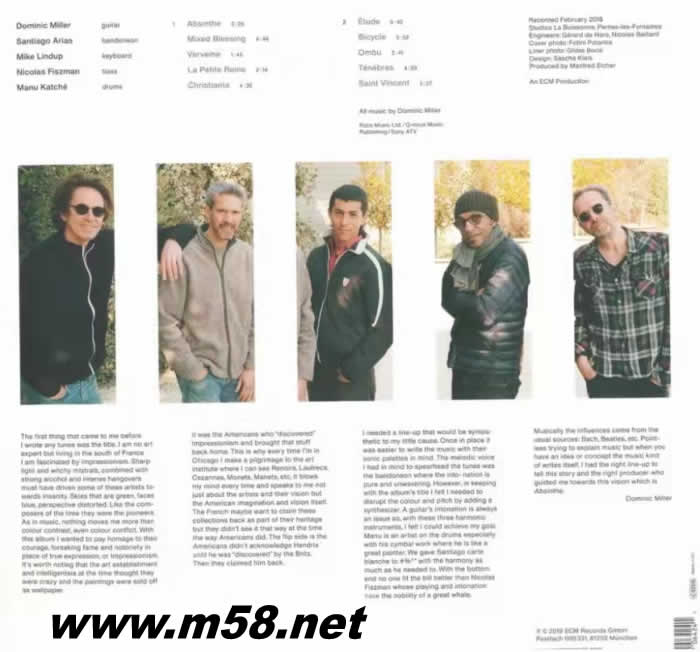 價格為估,以實到貨為準! 苦艾酒 ABSINTHE 拉丁五重奏(吉它、班多鈕手風琴、鍵盤、貝斯、鼓)黑膠(m58.net) Dominic Miller, guitar Santiago Arias, bandoneon Mike Lindup, keyboard Nicolas Fiszman, bass Manu Katche, drum Dominic Miller阿根廷吉它演奏家 1991年,加入Sting的樂隊,并在他的唱片中擔任吉他演奏, Dominic Miller古典吉他功力深厚,電吉他也很擅長!