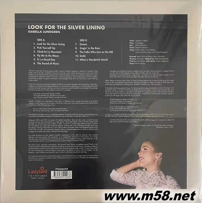 北歐爵士女聲ISABELLA LUNDGREN《LOOK FOR THE SILVER LINING》LP,來自瑞典的著名爵士歌手伊莎貝拉·隆格倫在她的第六張專輯中演奏多首經典爵士歌曲,如“Fly me to the Moon”、“Smile”和“What a Wonderful World”,以她特有的溫暖而略帶憂郁的聲音對這些歌曲進行了獨特的詮釋。專輯在斯德哥爾摩歷史悠久的亞特蘭蒂斯工作室錄制。與她合作的的都是現今瑞典著名的爵士樂手。180克黑膠。