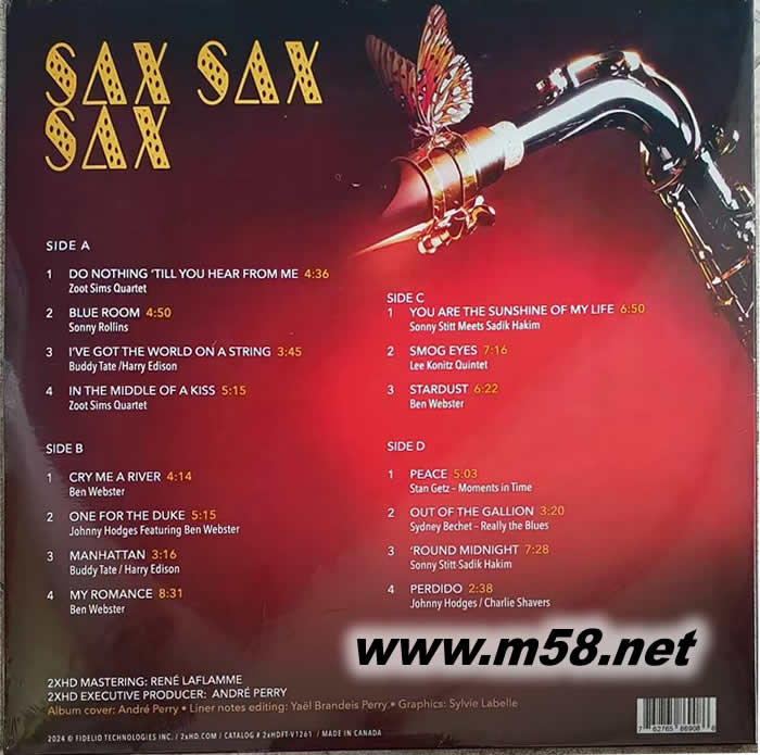 優秀的色士風演奏家包括Ben Webster、Sonny Rollins、Zoot Sims、Stan Getz、Lee Konitz等等。正如一場色士風盛宴,聽得手舞足蹈。這傳奇套裝,由10張專輯中收集得來的15個精彩表演。從最初只集結成專輯供下載購買,短時間成為下載榜的名列前茅,更被評介是靚聲又好聽,要聽抖動效果的顫音,吹到水花四濺,結合泛音與特殊的指法,用來炫技之超高音等等技巧,不會失望。AAA 100%純類比制作,加拿大2xHD使用Nagra(南瓜)專業級裝置進行母帶處理,重本在Bernie Grundman Mastering(博尼·葛朗德曼錄音室)以33 1/3RPM進行模擬剪輯。