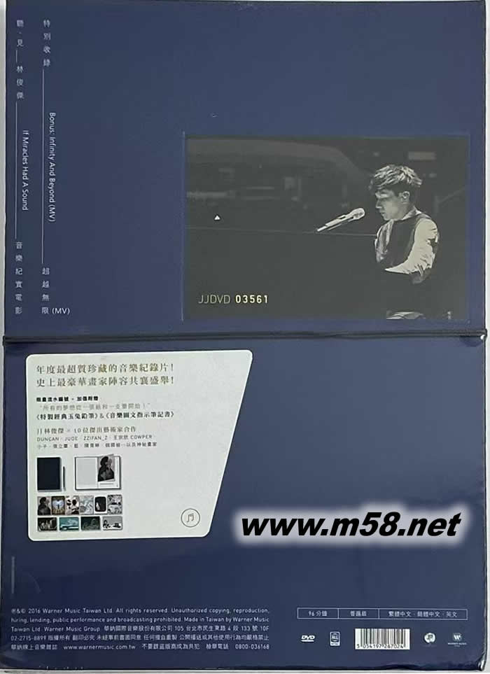 價格為估,以實到貨為準! IF MIRACLES HAD A SOUND 聽見林俊杰 DVD(m58.net) 亞洲唱作天王 JJ林俊杰 首部個人音樂紀實電影誕生 獻給所有音樂人以及音樂熱愛者 年度最超質珍藏的音樂紀錄片 限量流水編號 + 加值附贈: JJ林俊杰 x 10位杰出藝術家合作之音樂圖文指示筆記組 “所謂的“流行文化”,今時今日經常流于表面的解讀,對于流行音樂的產品,人們往往會忽略其中的過程與體驗-也就是其中的故事。這部紀錄片,是關于“我為什麼要做我在做的事”。我希望透過自己的真實歷程,以及參與這段歷程的朋友們的經驗分享,予以有夢想的人鼓勵。” ─ JJ林俊杰 聆“聽”音樂幕后制作全貌 看“見”不為人知的林俊杰 歷時455天 累計14400分鐘 橫跨美國、星馬、香港、臺灣… 一段他生命中最重要的歷程 一部關于音樂與人生的紀錄片 電影【十二夜】導演 ─ Raye執導 ▪ Face to Face: 首度揭露JJ專輯制作的誕生,見証音樂人最誠懇的音樂態度 2013~2015時線世界巡迴演唱會感動幕后 【新地球】專輯完整制作過程全收錄 臺前與幕后之間的林俊杰,真誠面對彼此的自省與反思 ▪ Heart to Heart: 挖掘歷年創作背后的真實故事,引薦JJ自少年時期一起追音樂夢的良師益友 卸下輝煌成就帶來的掌聲榮耀,披露JJ尋找音樂初衷的過程中所面對的挫折 “金曲歌王”的光環底下,不為人知的內心掙扎與心聲 ▪ Master to Master: 何謂 發詞、編曲、錄音、溷音、Mastering? 華語樂壇史上 首次完整揭露流行音樂制作的流程全貌 分享真正“聽懂”流行音樂訣竅! “看懂”音樂制作的門道! 難得一見的美、港、臺、星馬國際級音樂大師分享課 新加坡一代流行樂壇宗師:許環良 新加坡頂尖制作人/編曲人:吳慶隆 香港天王天后御用音樂監制:C.Y. Kong 臺灣知名溷音大師:林正忠 美國葛萊美獎音樂后制大師 :Richard Furch、Brian Gardner 華納大中華區總裁:陳澤杉 以及母校恩師、同學、好友、貼身助理、工作伙伴… and“葛萊美流行歌王 ─ Jason Mraz杰森瑪耶茲” ★【限量珍藏流水編號】★ 張張標有獨一無二限量珍藏流水編號 挑選專屬自己的獨有編號收藏 ★【超質珍藏Bonus】★ 最新單曲《超越無限》MV 音樂圖文指示筆記組─“所有的夢想從一張紙和一支筆開始!” 史上最豪華畫家陣容共襄盛舉! 超質附贈 超限量珍藏! 《特制經典玉兔鉛筆》乙枝 (19cm) 選用 臺灣元祖制筆品牌:玉兔牌經典鉛筆 筆身將特別印上JJ送給大家的夢想勵志座右銘 《音樂圖文指示筆記書》乙本 (17.5x25cm / 86P) 文字:JJ親自提供:給音樂熱愛者的十個指示Tips 圖像:10位正在實現夢想的圖像藝術家:Duncan、Jude、Zzifan_z、王宗欣Cowper、小子、張立羣、藍、陳青琳、姚國禎…以及神秘畫家 依照JJ的10個音樂Tips 繪制10幅專屬情境圖像 * 筆記書中將留有空白筆記頁可隨筆寫下自己的創意