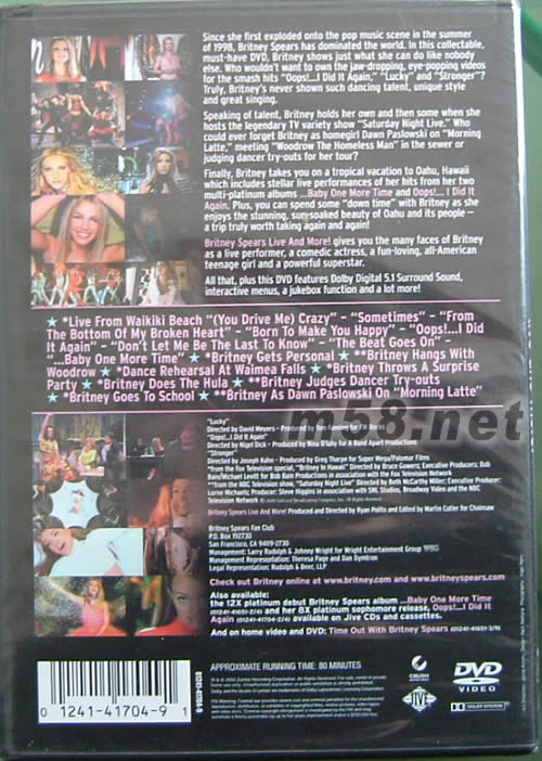 Features Region 1 Audio: Dolby Digital 5.1 - English Additional Realease Material: Bonus Short/Feature - On Tour in Paris/Tokyo Interactive Features: Interactive Menus Text/Photo Galleries: Stills/Photos DVD-ROM Features: Web Links^Chapters: 1. (You Drive Me) Crazy - Live From Waikiki Beach 2. Sometimes 3. From The Bottom Of My Broken Heart 4. Born To Make You Happy 5. Oops!. . . I Did It Again 6. Don't Let Me Be The Last To Know 7. The Beat Goes On 8. ...Baby One More Time 9. Britney Gets Personal 10. Britney Hands With Woodrow 11. Dance Rehearsal At Waimea Falls 12. Britney Throws A Surprise Party 13. Britney Does The Hula 14. Britney Judges Dancer Try-outs 15. Britney Goes To School 16. Britney As Dawn Paslowski On "Morning Latte"