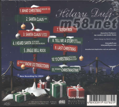 價格為估,以實到貨為準! Santa Claus Lane甜心的圣誕祝福(m58.net) 請點看產品正、背面大圖 一部收視率冠軍影集《平民天后Lizzie McGuire》,兩部賣座電影,首張大碟《甜心日記Metamorphosis》摘下排行冠軍,首支單曲"So Yesterday"勇奪單曲銷售榜冠軍,全美最當紅鄰家女孩Hilary Duff甜美外型橫掃大小銀幕,她那蜜糖般的稚嫩嗓音溶化全美電波,這下化身圣誕小甜心,發行首張圣誕大碟 Santa Clause Lane,用她的歌聲分送給樂迷最甜蜜的圣誕禮物。
