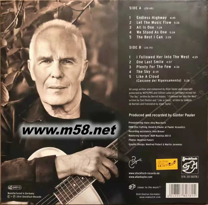 有吟游詩人之稱的完美唱作天皇阿倫.泰勒(Allan Taylor)以其沉實雄渾,感性中帶著風霜的聲線征服了不少樂迷,更被視為發燒男聲之翹楚,在其過往30多年的歌唱生涯中,創作了不少名曲,亦為他贏得無數的喝采和掌聲。泰勒相隔四年時間再度推出個人專輯大碟,接近70歲的他剛渡過人生中最嚴峻的考驗,因彈奏結他而患上肩膀嚴重的功能障礙,對深愛音樂的樂者來說這絕對是一個艱難的處境,幸好經過休養及治療,泰勒現已完全康復,與結他繼續其音樂歷奇之旅。泰勒用其一貫磁性感人的聲音,從容且帶點幽默地唱出【Endless Highway(無盡的公路)】、【Let The Music Flow(讓音樂飄浮)】、【All Is One(一即是全部)】、【We Stood As One(我們站為一體)】、【I Followed Her Into The West(我跟隨她來到西邊)】、【One Last Smile(一個最后的笑容)】、【The Sky(天空)】、【Like A Cloud(像云般)】、【The Best I Can(盡我所能)】與及【Plenty For The Few(給最多的予小眾)】,每一首歌曲都是精心雕啄、用心打造,由<老虎魚(Stockfisch)>專業錄音師悉心製作, B&W 801D 音箱鑑聽,以1:1直刻母盤、180克、33 1/3轉、處女膠製成、完全德國製造的黑膠盤推出,歌聲更為貼近原音,完美帶來泰勒人生中最具意思、最富韻味的一頁。