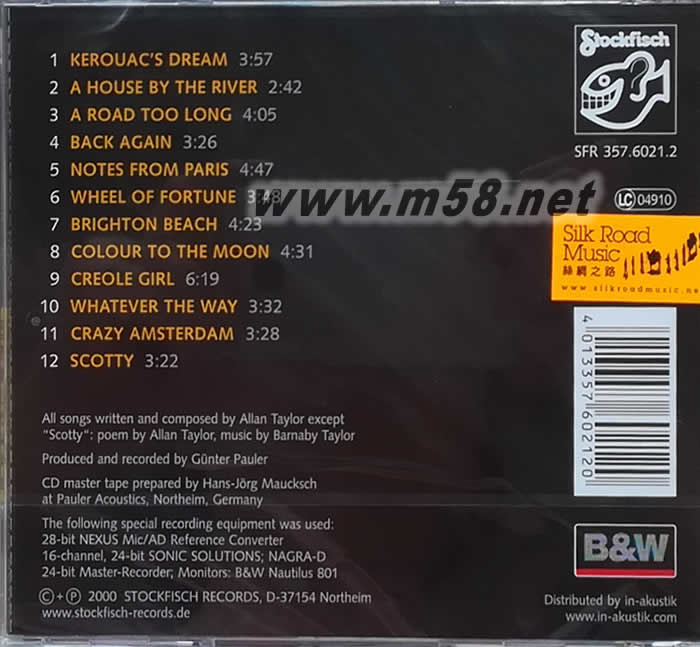 唱作詩人 ALLAN TAYOR(艾倫·泰勒)以他磁性感性的聲線及簡單純樸的結他勾弦聲及向你訴說他的回憶,如泣如訴!加以bB & W NAUTILUS 801 的MONITOR錄音效果,人聲和樂器的音像定位清晰而立體,三維護空間感覺強烈。不論演奏及錄音都是超水準之盤。