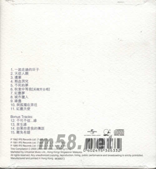 01. 一起走過的日子 02. 天從人愿 03. 遺棄 04. 熱血男兒 05. 不死的夢 06. 秋意中等我 - 吳婉芳合唱 07. 紅塵夢 08. 城市獵人 09. 緣盡 10. 與孤獨在奔往 11. 紅塵天使 Bonus Track 12. 不可不信…緣 13. 來生緣(國) 14. 如果你是我的傳說(國) 15. 難免有錯(國)
