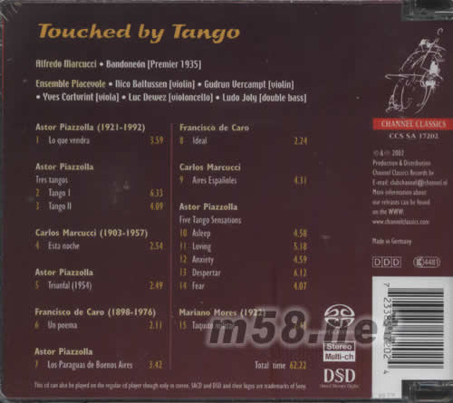 ASTOR PIAZZOLLA 1.LO QUE VENDRA ASTOR PIAZZOLLA TRES TANGOS 2.TANGO I 3.TANGO II GARLOS MARCUCCI (1903-1957) 4.ESTA NOCHE ASTOR PIAZZOLLA 5.TRIUNFAL(1954) FRANCISCO DE CARO(1898-1976) 6.UN POEMA ASTOR PIAZZOLLA 7.LOS PARAGUAS DE BUENOS AIRES FRANCISCO DE CARO 8.LDEAL CARLOS MARCUCCI 9.AIRES ESPANOLES ASTOR PIAZZOLLA FIVE TANGO SENSATIONS 10.ASLEEP 11.LOVING 12.ANXIETY 13.DESPERTAR 14.FEAR MARIANO MORES(1922) 15.TAQUITO MILITAR