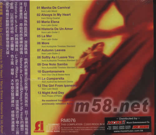 拉丁人被稱為熱血發(fā)族,浪漫熱情,他們的音樂正好反映了其民族性,拉丁音樂每每是洋溢著濃烈,原始和裸裸的感情,MANHA DE CARNIVA 與ALWAYS IN MY HEART 的幽怨,HISTORIA DE UN AMOR 的熱情奔放,LA MER 膠MORE 的浪漫溫馨,這張情迷拉丁里十三首金曲,以西班牙結(jié)他,爵士鋼琴,色士風,提琴,大牛筋交替演釋出,感覺淋漓盡致,是罕有精采動聽的輕音樂發(fā)燒天碟。