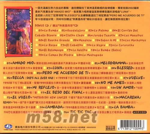一張充滿瘋狂張力放送的專輯、邀您體驗拉丁美洲溫柔動感的旋律感動,獨家收錄機2002福斯最新汽車廣告曲AMADO MIO 俊美實力唱將營造氣勢磅礴氛圍的演唱曲LUNA 溫柔醉人的拉丁冠軍情歌BLESSED以及蟬聯數周拉丁榜軍車曲PERO ME ACUERDO DE TI 等16首超值好歌,同時特別贈送“熱舞墨西哥”精彩20首曲目,讓您無限期熱情狂舞!