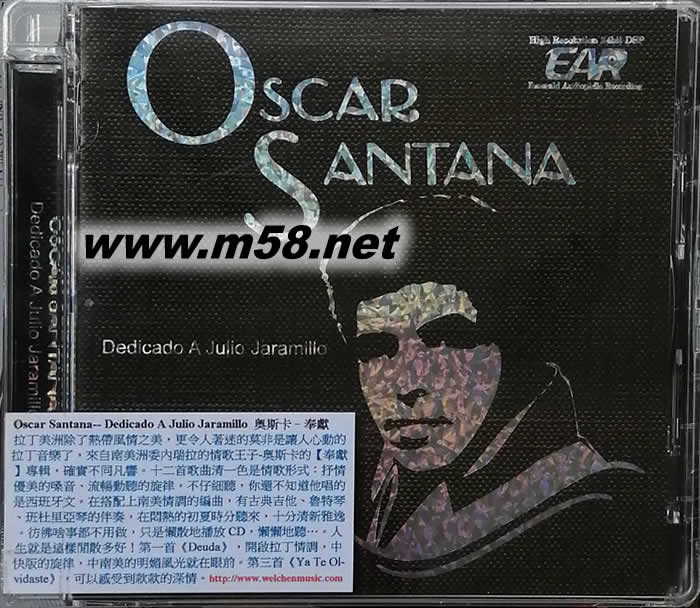 奧斯卡 山塔納 向胡里奧致敬 Oscar Santana - Dedicado A Julio Jaramillo(m58.net) 這是Emerald Audiophile公司最新發行的一款絕對發燒錄音專輯,內收錄了由拉丁情歌王子奧斯卡?山塔納傾情演唱的12首歌曲,強烈推薦。 委內瑞拉的拉丁情歌王子奧斯卡?山塔納在這款專輯中展現他充滿浪漫滑溜的自然嗓音,輕快多情的南美拉丁曲風;在濃烈節奏,吉他與鼓聲伴奏下,讓人彷佛在熱帶國度悠游。這款專輯主要表達了為歌手胡立歐的深深懷念,已故的厄瓜多歌手胡立歐生前紅遍南美洲,在50至70年代的情歌,帶給許多人美好回憶,也深深影響奧斯卡,其中一首《我的阿爾瑪》,奧斯卡以深邃豐富感情,明快流暢節奏,抒發對戀人的思念,深情吐露幾許哀傷,動聽感人。 值得一提,該唱片采用“翡翠CD”壓制,一種更臻成熟完美的翠綠聚碳酸脂高保真光盤。您如果對于高級的燒錄片稍有研究,一定就會聽過日本的太陽誘電公司,他們所推出的光盤片可說是最頂尖的產品,當然售價也高于一般光盤片許多。其實這間公司的專業是在光記錄媒體,換句話說,只要是使用光的方式來技術的媒材,他們可是真正的專家。根據他們的研究,CD片表面的顏色會影響CD唱盤雷射頭讀取的精確度,而采用“綠色聚碳酸脂”制作的CD可有效抑制一般CD片容易產生的微小反射與干擾,提高讀取的精確度。 現在就有唱片公司應用這種技術制作“翡翠CD”,比如Emerald Audiophile公司最新發行的不少唱片就如此,在聽感上,最明顯的變化就是分辨率更高,定位更清晰,音質也有明顯的優化,呈現出有如水晶一般的通透聲響。另外,最重要的是在壓制CD前的“母帶處理”,Emerald Audiophile公司這一系列“翡翠CD”當然也不可能馬虎,全系列重新制作高優質的母帶再以“翡翠CD”壓制,絕對能滿足音響迷最挑剔的耳朵。 專輯曲目