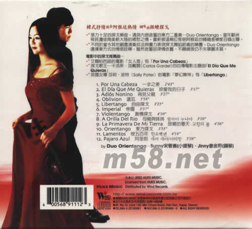微醺 探戈(小提琴與鋼琴)(m58.net) 在探戈之都--布宜諾斯艾利斯(BUENOS AIRES) 活躍的閃耀新星 探戈大師--破亞左拉(ASTOR PIAZZOLLA)遺孀LAURA ESCALADA給予高度評價的樂團 韓式抒情混合阿根廷熱情 調味出微醺探戈 張力十足的探戈樂曲,遇見內斂含蓄的東方二重奏--Duo Orientango,當年歐洲移民遷徙到南美新大陸的鄉(xiāng)愁之情,重新被這兩位客居阿根廷的韓籍音樂家召喚出聲。 不同于當今其他窮盡演奏技法與賣力表現(xiàn)探戈舞蹈節(jié)奏的樂團,Duo Orientango選擇東方式的情感詮釋,雖然含蓄卻深情依舊、不愿鋪張仍不失華麗本質。 電影中的探戈推薦曲^^^ 艾爾帕西諾的電影[女人香]有[POR UNA CABEZA] 探戈歌王一卡洛斯·加戴爾(CARLOS GARDEL)的自傳電影主題曲[EL DIA QUE ME QUIERAS] 英國女導 莎莉·波特(SALLY POTER)的電影[蘿幻舞神]有[LIBERTANGO]