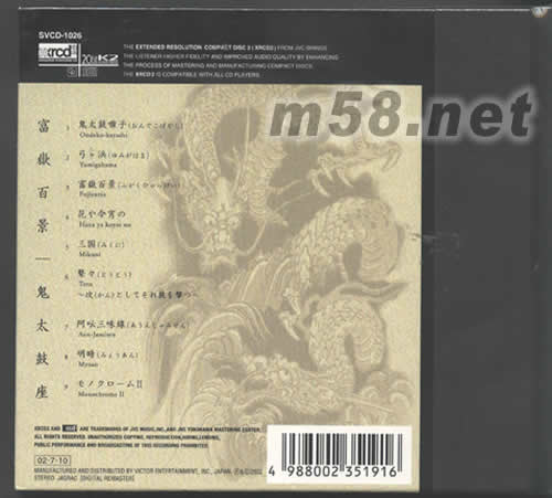 鬼太鼓的表演非常注重力與美的結(jié)合,也是東方文化精氣神極致的一種表現(xiàn),只是常被一些粗淺的樂友誤會(huì)鬼太鼓只是在一邊打鼓,一邊亂喊的音樂,那也實(shí)在是把鬼太鼓的表演藝術(shù)看得太膚淺一點(diǎn)。這一張「富獄百景」是1997年在日本青山縣文化會(huì)館的實(shí)況現(xiàn)場(chǎng)錄音,那時(shí)錄音采用最高級(jí)的1吋/二聲道Studer錄音機(jī)制作成模擬母帶,以JVC最頂尖的XRCD數(shù)碼科技,加上JVC最引以為傲的K2接口處理,令本片之中鼓聲的沉重低頻、空間感和樂器細(xì)節(jié)在回放時(shí)得以回復(fù)原貌,活生生的忠實(shí)再現(xiàn)直徑2公尺以上大鼓的極低頻及眾鼓齊發(fā)那種地動(dòng)山搖的驚人動(dòng)態(tài),細(xì)節(jié)栩栩如生,臨場(chǎng)感自然再現(xiàn),是鬼太鼓有史以來錄音最好的一張專輯(以前的錄音就很驚人了)。