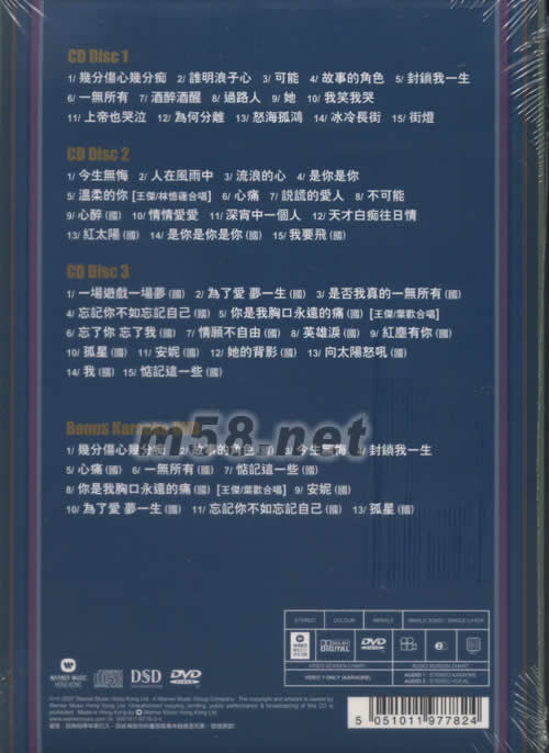 CD 1 01. 幾分傷心幾分癡 02. 誰明浪子心 03. 可能 04. 故事的角色 05. 封鎖我一生 06. 一無所有 07. 酒醉酒醒 08. 過路人 09. 她 10. 我笑我哭 11. 上帝也哭泣 12. 為何分離 13. 怒海孤鴻 14. 冰冷長街 15. 街燈 CD 2 01. 今生無悔 02. 人在風雨中 03. 流浪的心 04. 是你是你 05. 溫柔的你 (王杰, 林憶蓮) 06. 心痛 07. 說謊的愛人 08. 不可能 09. 心醉(國) 10. 情情愛愛 11. 深宵中一個人 12. 天才白癡往日情 13. 紅太陽 (國) 14. 是你是你是你(國) 15. 我要飛(國) CD 3 01. 一場游戲一場夢(國) 02. 為了愛 夢一生(國) 03. 是否我真的一無所有(國) 04. 忘記你不如忘記自己(國) 05. 你是我胸口永遠的痛(國) [王杰/齊歡合唱] 06. 忘了你,忘了我(國) 07. 情愿不自由 (國) 08. 英雄淚(國) 09. 紅塵有你 (國) 10. 孤星(國) 11. 安妮 (國) 12. 她的背影 (國) 13. 向太陽怒吼(國) 14. 我(國) 15. 惦記這一些(國) Bonus Karaoke DVD 01. 幾分傷心幾分癡 02. 故事的角色(國) 03. 今生無悔 04. 封鎖我一生 05. 心痛(國) 06. 一無所有(國) 07. 惦記這一些(國) 08. 你是我胸口永遠的痛(國)[王杰/齊歡合唱] 09. 安妮 (國) 10. 為了愛 夢一生(國) 11. 忘記你不如忘記自己(國) 12. 孤星(國)