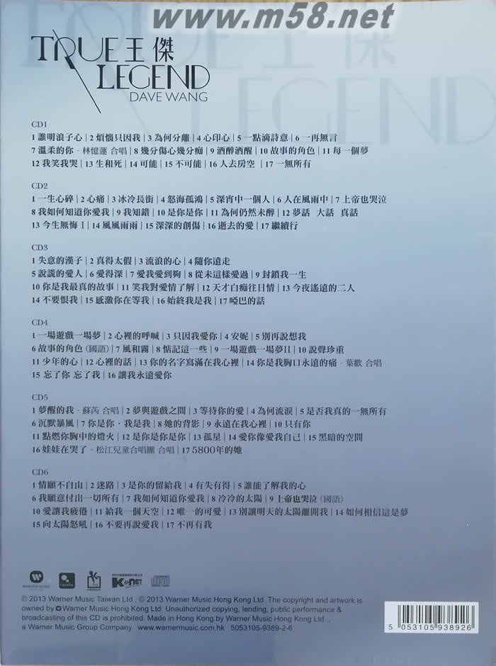 True Legend 傳奇真精選 (6CD套裝)(m58.net) 幾個世紀 才有一個王杰 幾番風雨 期待王者歸來 王杰 True Legend 101 傳奇真精選 101首國粵語代表作 昨日的浪子.今日的巨星.明日的傳奇 80~90年代華語樂壇最重要的歌手之一,王杰以滄桑的獨特嗓音與孤傲的浪子形象席卷華語樂壇,1987年出道的第一張專輯『一場游戲一場夢』便一炮而紅,其后在飛碟唱片發行的專輯幾乎張張暢銷,不僅在臺灣刮起了這陣“浪子旋風”,香港、東南亞以至當時的中國大陸、海外華人都因著王杰獨有的音樂風格深深吸引,至今其形塑出的巨星風范與典型,尚未有第二人可以仿效,王杰已是一個傳奇,一個無法被復制的經典。 飛碟時期,張張暢銷 王杰True Legend 101 6CD套裝集結了他于飛碟唱片時期,亦可說是其音樂的黃金時期,幾乎張張暢銷、百首經典好歌的終極精選,囊括了他以黑馬之姿,迅速攻占華語樂壇的首張專輯《一場游戲一場夢》、經典中的經典《忘了你忘了我》、與劉德華合作MV的《是否我真的一無所有》、杰迷愛不釋手的《孤星》和《向太陽怒吼》等,以及成功進軍香港樂壇、出版的多張暢銷粵語專輯101首必聽的王杰音樂作品。