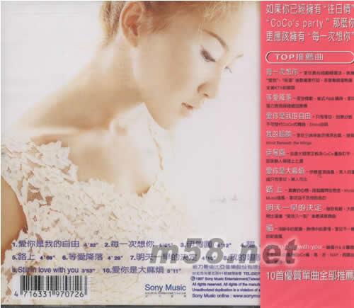 每一次想你(臺灣版)(m58.net) 97年唯一不能錯過的好專輯 李玟新力音樂真心全力優質呈獻 如果你已經擁有“往日情”“COCO‘S PARTY”那么你更應該擁有“每一次想你” TOP 推薦曲 每一次想你 李玟真心超巔峰唱法,姚謙繼“愛我”,“味道”后最滿意作品,名音樂頻道熱播,全省KTV必搶唱 等愛降落 夜空情歌,美式R & B精典,李玟落力表現保證值回票價 愛你是我的自由 只有李玟,別無分號,不可替代COCO式舞曲,DISCO必跳 我的翅膀 李玟三姐妹首次情深哈唱,媲美 VIND BENEATH THE WINGS 伊甸園 金曲大師李正帆為COCO 量身訂作,甜美動人保證上上選 愛你是大麻煩 抒情搖滾曲,黑人的靈魂只有李玟,無人可比 路上 真實的心情,跨越國界的思念,WORLD MUSIC 曲風,李玟迫不及等的告白 明天一早的決定 強勁有趣,大師鮑比達繼“愛我久一點”后最滿意舞曲 貓 冷靜中的節奏,熱情中的柔情,李玟不一樣的新曲風 STILL IN LOVE WITH YOU 韓國 R & B團體天王SOLID專為COCO編、寫、合、RAP,跨國金曲,值得一聽 10首優質單曲全部推薦