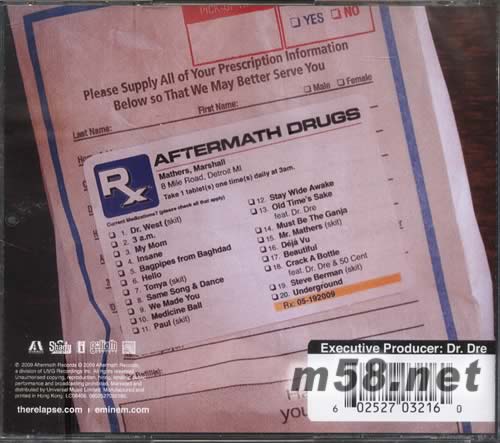 01. Dr. West (Skit) 02. 3 A.M. 03. My Mom 04. Insane 05. Bagpipes from Baghdad 06. Hello 07. Tonya (Skit) 08. Same Song & Dance 09. We Made You 10. Medicine Ball 11. Paul (Skit) 12. Stay Wide Awake 13. Old Time's Sake - Dr. Dre, Eminem 14. Must Be the Ganja 15. Mr. Mathers (Skit) 16. Déjà Vu 17. Beautiful 18. Crack a Bottle - Dr. Dre, Eminem, 50 Cent 19. Steve Berman