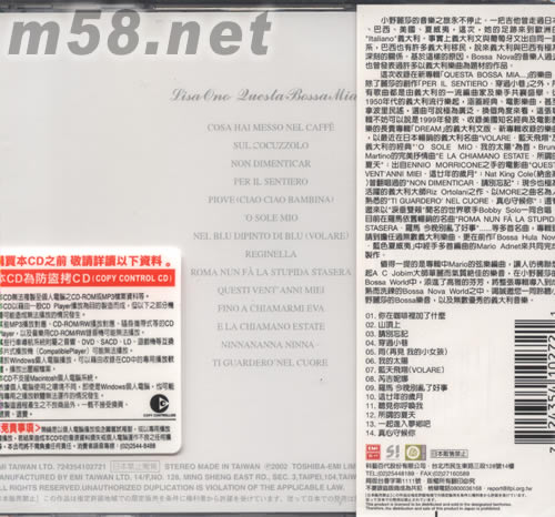 價(jià)格為估,以實(shí)到貨為準(zhǔn)! 我的BOSSA NOVA(m58.net) ESPRESSO咖啡醇香,羅馬的和熙向陽(yáng),BOSSA NOVA多美好 麗莎本人精選50年代意大利經(jīng)典+電影名曲+流行樂(lè)+地方樂(lè)曲 意大利樂(lè)曲遇見(jiàn)BOSSA NOVA,成熟洗練樂(lè)風(fēng)令人耳目一新。 小野麗莎的音樂(lè)之旅永不停止,一把吉他曾走過(guò)日本、巴西、美國(guó)、夏威夷,這次,她的足跡來(lái)到歐洲的“ITALIANO”意大利。事實(shí)上意大利文興葡萄牙文出自同一語(yǔ)系,巴西也有許多意大利移民,說(shuō)來(lái)意大利與巴西有極為深刻的關(guān)系。基于這樣的原因,BOSSA NOVA的音樂(lè)人過(guò)去也曾發(fā)表過(guò)許多以意大利樂(lè)曲為題材的作品。 這次收錄在新專(zhuān)輯[QUESTA BOSSA MIA……]的樂(lè)曲,除了麗莎的創(chuàng)作[PER IL SENTIERO,穿過(guò)小巷]之外,所有歌曲都是由意大利的一流編曲家及樂(lè)手共襄盛舉。從1950年人的意大利流行樂(lè)起,涵蓋經(jīng)典、電影樂(lè)曲、基至拿波里民謠,選曲可說(shuō)極為廣泛。換個(gè)角度來(lái)看,這張專(zhuān)輯不妨可以說(shuō)是1999年發(fā)表、收錄美國(guó)知名經(jīng)典及電影配樂(lè)的長(zhǎng)賣(mài)專(zhuān)輯[DREAM]的意大利版。新專(zhuān)輯收錄的樂(lè)曲,以最近在日本暢銷(xiāo)的意大利名曲“VOLARE 藍(lán)天飛翔”及意大利的經(jīng)典“O SOLE MIO 我的太陽(yáng)”為首,BRUNO MARTINO的完美抒情曲“E LA CHIAMANO ESTATE所謂的夏天”:出自ENNIO MORRICONE之手的電影QUESTI VENT ANNI MIEI這幾年的歲月“:4NAT KING COLE(納金高)曾翻唱的”NON DIMENITCAR請(qǐng)別忘記:“現(xiàn)今也極為活耀的意大利大師RIZ ORTOLANI之作、以MORE之曲名為人熟悉的”TI GUARDERO,NEL CUORE真心守候你”:還有邀來(lái)以“淚垂雙頰“聞名的世界歌手BOBBY SOLO一同合唱、目前在羅馬依舊暢銷(xiāo)的名曲”ROMA NUN FA LA STUPIDA STASERA羅馬 今晚別亂了好事:”…等多首名曲,專(zhuān)輯更請(qǐng)到擔(dān)任過(guò)無(wú)數(shù)意大利樂(lè)曲、更在前作[BOSSA HULA NOVA 蒺色夏威夷]中經(jīng)手多首編曲的MARIO ADNE來(lái)共同完成制作。 值得一提的是專(zhuān)輯中MARIO的弦樂(lè)曲,讓人彷佛聯(lián)想起A C JOBIM大師華麗而氣質(zhì)絕佳的樂(lè)音,在小野麗莎的BOSSA WORLD中,添進(jìn)了高雅的芬芳,將整張專(zhuān)輯導(dǎo)入到成熟而洗練的BOSSA NOVA WORLD之中。竭誠(chéng)邀您一同聆聽(tīng)小野麗莎的BOSSA 樂(lè)音,以及無(wú)優(yōu)秀的意大利音樂(lè)。 1、你在咖啡里加了什么 2、山頂上 3、請(qǐng)別忘記 4、穿過(guò)小巷 5、雨(現(xiàn)見(jiàn),我的小女孩) 6、我的太陽(yáng) 7、藍(lán)天飛翔(VOLARE) 8、芮吉妮娜 9、羅馬 今晚別亂了好事 10、這幾年的歲月 11、聽(tīng)見(jiàn)你呼喚我 12、所謂的夏天 13、一起進(jìn)入夢(mèng)鄉(xiāng)吧 14、真心守候你