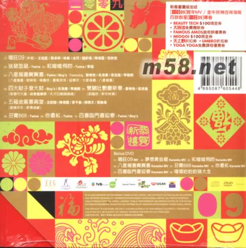 CD 01. 唱旺09 (蔡卓妍 / 王祖藍(lán) / 陳偉霆 / 泳兒 / 林峯 / 鍾舒漫 / 張致恒) 新歌 02. 送豬型鼠 (Twins) 03. 紅噹噹飛吻 (Twins + 草蜢) 04. 八星報(bào)喜賀賀喜 (Twins / Boy'z / featuring鄭希怡 / 吳浩康 / 梁洛施 / 李逸朗) a. 八星報(bào)喜 b. 財(cái)神到 c. 恭喜你 d. 喜氣洋洋 e. 迎春花 f. 大家恭喜 g. 八星報(bào)喜 05. 四大才子發(fā)大財(cái) (Boy'z / 吳浩康 / 李逸朗) a. 新春行大運(yùn) b. 錢會繼續(xù)嚟 c. 天才白癡 ‘錢錢錢’ 06. 雙驕吐艷慶新春 (鄭希怡 / 梁洛施) a. 祝福你 b. 新年快樂 07. 五福金雞喜滿堂 (王凱駿 / 陳偉霆 / 麥子豪 / 蔣雅文 / 黃敏儀) c. 歡樂年年 d. 新春頌獻(xiàn) 08. 孖寶668 (Twins) 09. 你最紅 (Twins) 10. 四喜臨門喜迎春 (Twins / Boy'z) DVD 01. 唱旺09MV 02. 夢想黃金屋Karaoke MV 03. 紅噹噹飛吻 Karaoke MV 04. 八星報(bào)喜賀賀喜Karaoke MV 05. 孖寶668 Karaoke MV 06. 你最紅 Karaoke MV 07. 四喜臨門喜迎春Karaoke MV 08. 嘻嘻哈哈哈碌大全
