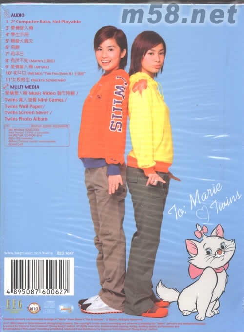 Audio 01-02. Computer Data Not Playable 03. 愛情當入樽 04. 學生手冊 05. 戀愛大過天 06. 飛線 07. 和平日 08. 有所不知(Disney卡通 "Marie"主題曲) 09. 愛情當入樽(Air Mix) 10. 和平日〔We Mix〕「Fun Fun Show 01 主題曲」 11. 女校男生(Back To School Mix) Multi Media 愛情當入樽 Music Video 精彩片斷及制作特輯 Twins真人發聲Mini Games Twins Wall Paper (電腦桌面墻紙) Twins Screen Saver (電腦屏幕保護) Twins Photo Album