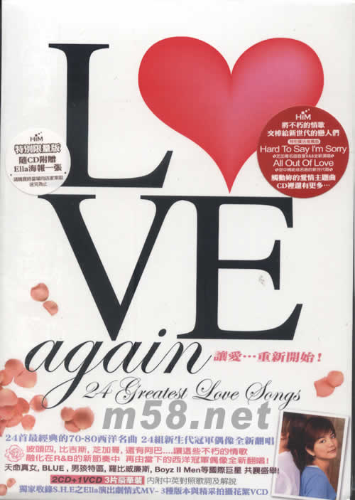 價格為估,以實到貨為準! LOVE AGAIN 讓愛……重新開始!(特別限量版)(m58.net) 3片豪華裝,內附中英對照歌詞及解說 隨碟贈ELLA海報一張 HIM將不朽的情歌交棒給新世代的戀人們 特別廣告推廣曲 HARD TO SAY I‘M SORRY 芝加哥名曲首度R&B全新演唱 ALL OUT OF LOVE 空中補給成名曲的新世代版 觸動你的愛情主題曲 CD里還有更多……