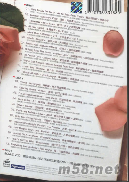DISC 1 01. Hard To Say I m Sorry-Az Yet 難以說抱歉-神氣小子(原唱:Chicago芝加哥合唱團)娃娃臉調教之R&B五人組,冠軍翻唱芝加哥樂團82年流行金榜冠軍名曲。 02. Emotion-Destiny s Child 情感-天命真女(原唱:Samantha Sang&Barry Gibbs比吉斯與莎曼莎姍)碧昂斯所屬葛萊美獎最佳節奏藍調團體2001年以醉人和聲重新詮釋比吉斯名曲。 03. Yesterday-Boyz Ⅱ Men 昨日-大人小孩雙拍檔(原唱:Beatles披頭四)披頭四經典由葛萊美獎最佳R&B名團以清唱方式演唱,層次分明的完美詮釋。 04. All Rise-BLUE 全體肅立-BLUE (翻唱:B.A.D)全英最熱偶像天團,控訴劈腿族的冠軍單曲,由B.A.D同步翻唱成國語版本。 05. More Than A Woman-911 不只是女人-911 (原唱:Bee Gees 比吉斯)比吉斯迪斯可冠軍代表作,英國人氣3人男孩團來中必唱英國金榜亞軍熱歌。 06. Words-Boyzone 雙字片語-男孩特區 (原唱:Bee Gees比吉斯)90的代首席愛爾蘭男孩團體將比吉斯名曲娓娓唱來,榮獲英國金榜冠軍單曲。 07. Better Man-Robbie Williams 好男人-羅比威廉斯(翻唱:林憶蓮)壞小子羅比威廉斯內心最深處的告白,林憶蓮動人翻唱成為國語金曲。 08. Holding Back The Years-Another Level 回首舊時光-超凡四帥(原唱:Simply Red就是紅)大哥大Jay-Z于英國培植的R&B四人組,99年攻上Top10之靈魂風味翻唱。 09. All Out Love-Jagged Edge 愛已用盡-鋸齒邊緣合唱團(原唱:Air Supply空中補給合唱團)美國R&B組合在電影“神鬼拍檔”中,以R&B美聲全新詮釋空中補給必備之作。 10. We ve Got Tonight-Ronan Keating Feat.Lulu 我們擁有今夜-羅南與露露(原唱:Kenny Rogers&Sheena Easton肯尼羅杰斯與席娜依絲頓)男孩特區主唱羅南,挑戰83年橫跨成人抒情,鄉村及流和榜經典對唱曲 11. Lovin You-Shanice 愛上你-仙妮絲(原唱:Minnie Riperton米妮雷普頓)米西亞,平井堅爭相翻唱挑戰之動人情歌,仙妮絲91年甜蜜超高音詮釋。 12. I Drove All Night-Cyndi Lauper 徹夜奔馳-辛蒂露波(原唱:Roy Orbison洛伊歐賓森 翻唱:Celine Dion席琳迪翁)葛萊美獎搞怪天后1989年的Top10金曲,席琳迪翁也于2003年情有獨鐘翻唱。 DISC 2 01. Venus-No Angels 維納斯-無天使合唱團(原唱:Shocking Blue)1970年流行榜冠軍杰作,德國最熱美艷四人女子團性感詮釋。 02. Dancing Queen-A-Teen 舞后-阿巴少年組(原唱:ABBA阿巴)瑞典的7年級生,吸取ABBA音樂精華,紅遍歐陸的冠軍翻唱版。 03. I m Sitting Down Here-Lene Marlin 我坐在這里-琳恩瑪蓮(翻唱:林憶蓮)林憶蓮與江美琪音樂共鳴的北歐音樂精靈,令人一聽就愛的必備曲。 04. Take on Me-A1 接受我-優格男孩(原唱:A-ha阿哈合唱團)挪威團A-ha橫掃世界名曲,由英國A1優格男孩2000年再度冠軍主打翻唱。 05. Drive-Breeze 送你回家-微風合唱團(原唱:The Cars汽車合唱團)歐陸雙人組訪華期間必推薦曲,翻唱汽車合唱團84的季軍動人名曲。 06. Can t Help Falling In Love-UB40 無法不墜入情網-UB40(原唱:Elvis貓王)"雷鬼團體UB40為莎朗史東的電影""銀色獵物"成功翻唱貓王,寫下排行冠軍。 07. Only You-Flying Pickets 只要你-飛行哨兵(原唱:Yazoo雅族合唱團)陳予新[只要你想起我]原曲,曾來臺演出的英國人聲樂團,重新詮釋出神入化。 08. Heave(Candlelight Version)-DJ Sammy 天堂-DJ山米(原唱:Bryan Adams布萊恩亞當斯)加拿大超級搖滾巨85年全球冠軍單曲,2003年DJ山米再次唱上全美排行Top10。 09. How Deep Is Your Love-Portrait 愛有多深-人像合唱團(原唱:Bee Gees比吉斯)77年比吉斯流行榜冠軍單曲,人像合唱團95年重要詮釋再度登上排行。 10. Leaving On A Jet Plane-Chantal Kreviazuk 乘著飛機離去-香岱兒(原唱:John Denver約翰丹佛)加合大朱諾音樂獎最佳女歌手,為電影[世界末日]重新翻唱約翰丹佛73年作品。 11. I Can t Tell You Why-Brownstone 說不出為什么-褐石合唱團(原唱:Eagles老鷹合唱團)麥可杰克森力捧R&B美聲女子三人組重新R&B詮釋老鷹合唱團79年排行金曲。 12. Everytime You Go Away-Paul Young 每一次當你離去-保羅楊(原唱:Hall&Oates霍爾與奧茲)保羅楊以白人靈魂嗓音奪下多國排行冠軍,也成為翻唱超越原曲的最佳代表作。 DISC 3 BONUS VCD 獨家收錄S.H.E之Ella演出劇情式MV-3種結局完整版與拍攝花絮VCD