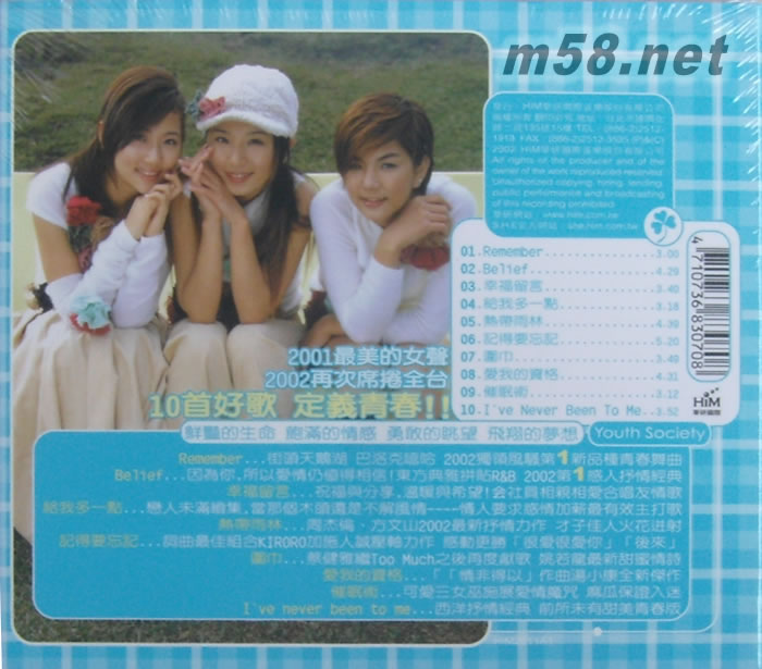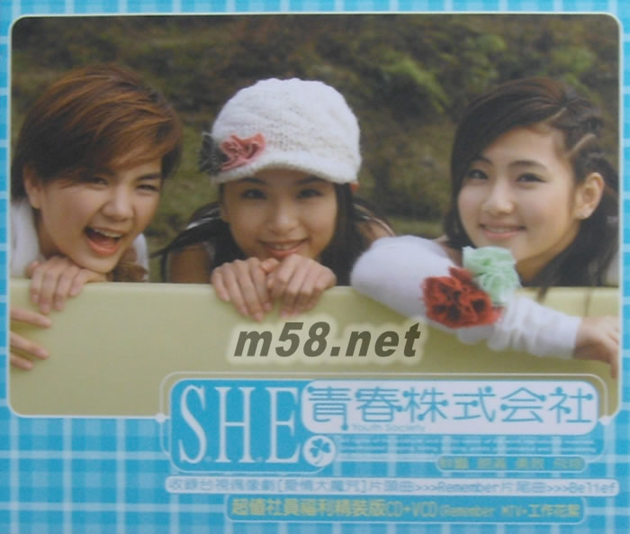 青春株式會社(超值社員福利精裝版)(m58.net) 鮮艷 飽滿 勇敢 飛翔 2001年9月才崛起的女生團體S.H.E.,由于首張專輯反應甚佳,3個小女生的演藝事業也一飛沖天,唱片公司乘勝追擊,在第一張專輯發行四個月后即推出新專輯《青春株式會社》。這張的音樂型態比第一張更進步,更請來周杰倫、湯小康、左安安、施人誠等一線音樂人為她們作詞作曲,豐富第二張專輯的音樂。