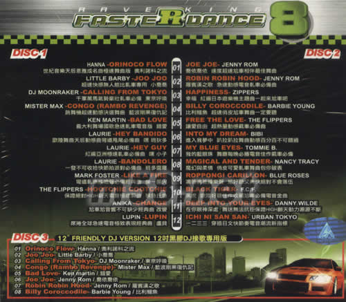 CD2 1. Joe Joe - Jenny Rom - 喬依喬依 速度超速尬車相伴最佳舞曲 2. Robin Robin Hood –Jenny Rom - 羅賓漢之歌 急速動感電音軋車必備曲 3. Happiness – Zippers - 幸福 紅遍日本游樂機主題曲一起來尬車吧 4. Billy Coroccodile – Barbie Young - 比利鱷魚 超速俏皮尬車舞曲一定要聽 5. Free The Love – The Flippers - 讓愛自由 超熱量動感飚車必備曲 6. Into My Dream – Bibi - 進入我夢中 趴拉趴拉舞曲動感百分百不可錯過 7. My Blue Eyes – Tommie B. - 我的藍眼珠 舞廳每晚必播電音佳作飚車必備 8. Magical And Tender – Nancy Tracy - 魔幻與柔情 俏皮可愛軋車舞曲包你破表 9. Roppongi Carillon – Blue Roses - 滴答滴答鐘樂聲 好聽又夠快絕對不會落伍 10. Black Tiger – F.C.F. - 黑虎 歐陸好聽佳作收藏尬車必備電音金曲 11. Deep Into Your Eyes – Danny Wilde - 在你眼神深處 舞迷無法抗拒保證HIGH翻天動力源源不斷 12. Ichi Ni San San – Urban Tokyo - 一二三三 穿插日文快節(jié)奏電音潮流新指針 CD 3 12” Friendly DJ Version 12吋黑膠DJ接歌專用版 1. Orinoco Flow – Hanna - 奧利諾科之流 2. Joo Joo – Little Barby - 小喬喬 3. Calling From Tokyo – DJ Moonraker - 東京呼喚 4. Congo (Rambo Revenge) – Mister Max - 藍波剛果復(fù)仇記 5. Bad Love – Ken martin - 錯愛 6. Joe Joe - Jenny Rom - 喬依喬依 7. Robin Robin Hood –Jenny Rom - 羅賓漢之歌 8. Billy Coroccodile – Barbie Young - 比利鱷魚