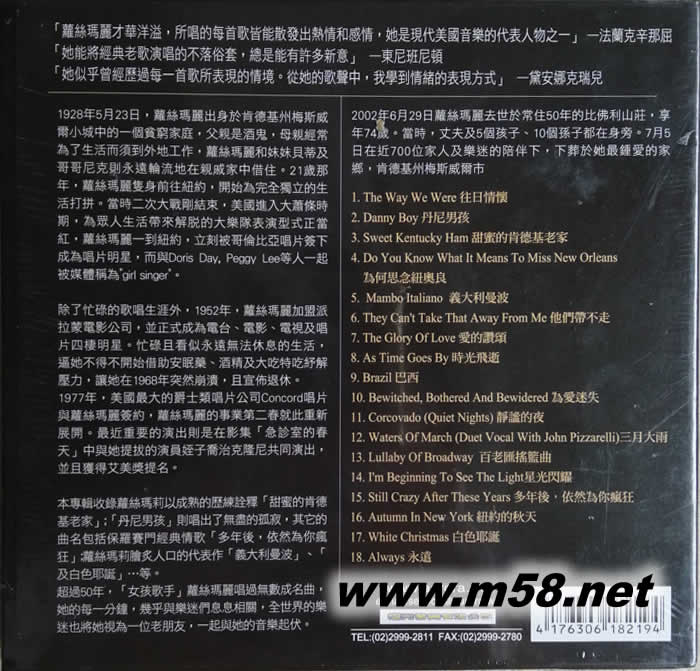 永遠(yuǎn)的女孩歌手FOREVER GIRL SINGER (限量紀(jì)念版)(m58.net) 「蘿絲瑪麗才華洋溢,所唱的每首歌皆能散發(fā)出熱情和感情,她是現(xiàn)代美國(guó)音樂的代表人物之一」~法蘭克辛那屈 「她能將經(jīng)典老歌演唱的不落俗套,總是能有許多新意」~東尼班尼頓 「她似乎曾經(jīng)歷過每一首歌所表現(xiàn)的情境。從她的歌聲中,我學(xué)到情緒的表現(xiàn)方式」~黛安娜克瑞兒 本專輯收錄蘿絲瑪莉以成熟的歷練詮釋「甜蜜的肯德基老家」;「丹尼男孩」則唱出了無盡的孤寂,其它的曲名包括保羅賽門經(jīng)典情歌「多年后,依然為你瘋狂」;蘿絲瑪莉膾炙人口的代表作「義大利曼波」、及「白色耶誕」。 超過50年,「女孩歌手」蘿絲瑪麗唱過無數(shù)成名曲,她的每一分鐘,幾乎與樂迷們息息相關(guān),全世界的樂迷也將她視為一位老朋友,一起與她的音樂起伏。 2002年6月29日去世於常住50年的比佛利山莊,享年74歲。當(dāng)時(shí)丈夫及5個(gè)孩子、10個(gè)孫子都在身旁。7月5日在近700位家人及樂迷的陪伴下,下葬於她最鐘愛的家鄉(xiāng),肯德基州梅斯威爾市。