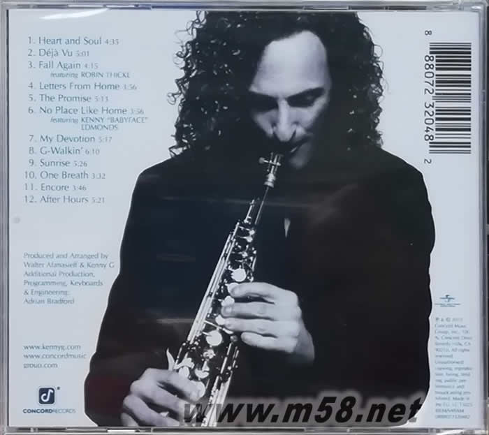 在浪漫動人的肯式風格樂曲"Heart and Soul"、"Déjà Vu"、"My Devotion"、"One Breath"之外,肯尼吉特地邀請兩位深具音樂創(chuàng)作與歌唱才華的藝人—10座葛萊美獎贏家娃娃臉(Babyface)、3座葛萊美獎得主羅賓西克(Robin Thicke *暢銷曲"Magic"曾在2008年被選用為Samsung U900 Soul手機廣告曲)跨刀獻唱,展現(xiàn)薩克風樂聲與人聲的絕美共鳴,呈現(xiàn)出羅賓西克瀰漫都會性感風情的戀曲"Fall Again",以及娃娃臉散發(fā)動人情感的戀家衷曲"No Place Like Home "。
