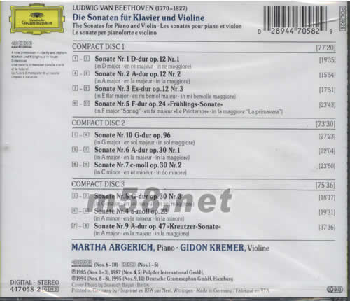 COMPACT DISC 1 1-3.SONATE NR.1 D-DUR OP.12 NR.1 (IN D MAJOR.EN RE MAJEUR.IN RE MAGGIORE) 4-6.SONATE NR.2 A-DUR OP.12 NR.2 (IN A MAJOR.EN RE MAJEUR.IN RE MAGGIORE) 7-9.SONATE NR.3 ES-DUR OP.12 NR.3 (IN E FLAT MAJOR.EN MI BEMOL MAJEUR.IN MI BEMOLLE MAGGIORE) 10-13.SONATE NR.5 F-DUR OP.24 FRUHLINGS-SONATE (IN F MAJOR"SPRING".EN FA MAJEUR"LE PRINTEMPS".IN FA MAGGIORE"LA PRIMAVERA") COMPACT DISC 2 1-4.SONATE NR.10 G-DUR OP.96 (IN MAJOR.EN SOL MAJEUR.IN SOL MAGGIORE) 5-7.SONATE NR.6 A-DUR OP.30 NR.1 (IN A MAJOR.EN LA MAJEUR.IN LA MAGGIORE) 8-11.SONATE NR.7 C-MOLL OP.30 NR.2 (IN C MINOR.EN UT MINEUR.IN DO MINORE) COMPACTDISC 3 1-3.SONATE NR.8 G-DUR OP.30 NR.3 (IN G MAJOR.EN SOL MAJEUR.IN SOL MAGGIORE) 4-6.SONATE NR.4 A -MOOL OP.23 (IN A MINOR.EN LA MINEUR.IN LA MINORE) 7-9.SONATE NR.9 A -DUR OP.47 KREUTZER-SONATE (IN A MAJOR .EN LA MAJEUR.IN LA MAGGIORE)