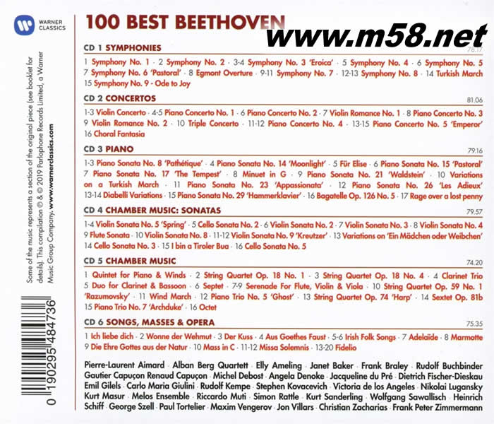 100 BEST BEETHOVEN 100 貝多芬百分百 6CD套裝(m58.net) 貝多芬是真正堪稱「樂圣」而無愧的一個人?!甘ァ咕褪恰笜O致」,只能被發揚、傳承或衍生,不可能被超越或取代;至今貝多芬仍是支持整個西方音樂體系的主要巨干。大部份近代的音樂潮流和思想,從布拉姆斯、華格納到荀貝格,從管弦樂法到鋼琴流派,都可追溯和貝多芬的源流關係。 貝多芬的創作時期約可以分成三個時期:第一個時期是對前輩海頓、莫札特的模仿期,代表作有第一號交響曲、早期鋼琴奏鳴曲;第二時期是到1814年的盛年期,作品充滿力度和熱情,例如著名的《命運》、《英雄》、《田園》交響曲,《熱情》、《悲愴》、《熱情》奏鳴曲……等。晚年作品充滿深沉的人生歷練,作品宏偉而富有前瞻性,如《合唱》交響曲、《莊嚴彌撒》、后期弦樂四重奏……等。 貝多芬兩百五十週年冥誕將至,華納音樂發行這一套選出貝多芬最佳百軌音樂的選集。除了從EMI自1950年代后期一直到1990年代的錄音中,精心選出最能代表貝多芬風格的音樂,第八號鋼琴奏鳴曲《悲愴》、小提琴協奏曲、第五號鋼琴協奏曲《皇帝》、第五號小提琴奏鳴曲《春》都是完整收錄,讓愛樂者在有限的時間里,仍有機會更全面了解貝多芬。其他演出者包括:艾馬爾、貝爾格弦樂四重奏、愛默玲、珍娜‧貝克、布赫賓德、高提耶‧卡普松、雷諾‧卡普松、杜普蕾、費雪狄斯考、朱里尼、肯培、柯瓦謝維契、安赫麗絲、盧岡斯基、馬舒、慕提、拉圖、桑德林、薩瓦利希、海因里希‧席夫、塞爾、托特里葉、凡格洛夫、扎哈里埃、齊默曼等人。