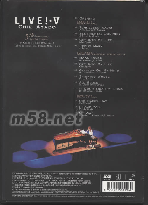 本DVD輯錄200212月綾戶智繪出道五周年紀念演唱會的精彩錄像,錄影地點包括東京的TOKYO INTERNATIONAL FORUM HALL 及大孤的OSAKA-JO HALL,共演唱14首作品,包括:TENNESSEE WALTZ,SENTIMENTAL JOURNEY ,GEORGIA ON MY MIND,MY WAY,IT DON‘T MEAN A THING等,絕對精彩!