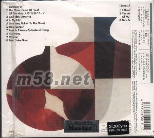 1、SATISFACTION 2、THE MAN THEME OF PROOF OF THE MAN 3、GOD BLESS AMERICA 4、IN MY LIFE 5、ONE WAY TICKET (TO THE BLUES) 6、SLOW DANCER 7、LOVE IS A MANY-SPLENDORED THING 8、YESTERDAY 9、WOMAN 10、BOTH SIDES NOW BOUNS ALBUM 1、IT DON‘T MEAN A THING 2、YOU ARE THE SUNSHINE OF MY LIFE 3、NEW YOUK STATE OF MIND