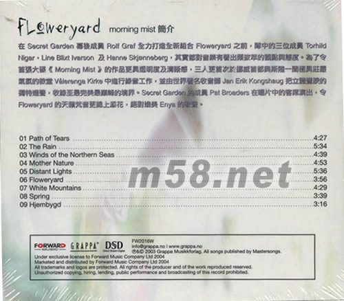 在Secret Garden幕后成員Rolf Graf全力打造全新組合Floweryard之前,隊中的三位成員Torhild Nigar,Line Blixt Ivarson及Hanne Skjonneberg,其實都對音樂有著出類拔萃的觀點與態度。為了令首張大碟[Morning Mist]的作品更具透明度及清晰感,三人更首次于挪威首都奧斯陸一間極具莊嚴氣氛的教堂Valerenga Kirke中進行錄音工作,并由世界著名收音師Jan Erik Kongshaug把立體豐腴的獨特回聲,收錄至最完美最巔峰的境界。Secret Garden的成員Pat Broaders在唱片中的客席演出,令Floweryard的天籟梵音更錦上添花,絕對媲美Enya的歌聲