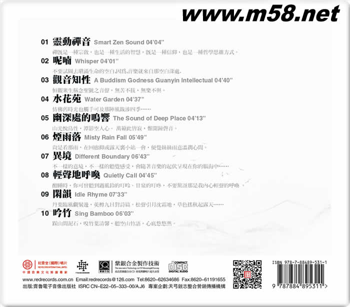 01 靈動(dòng)禪音 Smart Zen Sound 04’04” 禪既是一種宗教,也是一種生活的智慧,既是一種信仰,也是一種哲學(xué)思維方式。 02 呢喃 Whisper 04’01” 不要試圖去填滿生命的空白,因?yàn)?音樂就來自那空白深處. 03 觀音知性 A Buddism Godness Guanyin Intellectual 04’40” 恒觀眾生稱念圣號(hào)之音聲,無苦不拔,無樂不與。 04 水花苑 Water Garden 04’37” 仿佛舊時(shí)光也觸手可及那陣風(fēng)跋涉四季…… 05 幽深處的鳴響 The Sound of Deep Place 04’13” 山光悅鳥性,潭影空人心。 萬籟此皆寂,惟聞鐘磬音。 06 煙雨落 Misty Rain Fall 05’49” 尚是看那雨,在回廊抑或露天里小站一會(huì),便覺絲絲雨意溫潤心間。 07 異境 Different Boundary 06’43” 不一樣的意境,不一樣的聽覺感受,會(huì)隨著音樂的起伏呈現(xiàn)在你的腦海中…… 08 輕聲地呼喚 Quietly Call 04’45” 酣睡時(shí),你可曾聽到過風(fēng)鈴的叮呤、甘泉的叮咚,不要驚訝那是我內(nèi)心輕聲的呼喚 。 09 閑韻 Idle Rhyme 07’33” 丹葉臨風(fēng)覷鬢邊,萸樽九日對(duì)詩篇。松聲引月沈霜地,草色搖秋起露天…… 10 吟竹 Sing Bamboo 06’03” 踩山間泥石,嗅竹葉清馨,聽空山竹語,心底悠悠然。