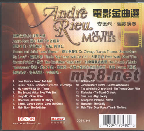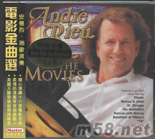 AT THE MOVIES電影金曲選(m58.net) 請點看產品正、背面大圖 國際知名小提琴大師ANDRE RIEU安德烈 瑞歐! 精心演繹十六首電影名曲 柔情的演奏琴音細致動人 美國天龍發燒級通透錄音 ANDRE RIEU精心演繹十六首經典電影名曲,首首精彩,包括:殉情記ROMEO AND JULIET “LOVE THEME齊瓦哥醫生DR ZHIVAGO “LARA‘S THEME/SOMEWHERE MY LOVE”鐵達尼號TITANIEC“MY HEART WILL GO ON ”,大開眼界“EYES WIDE WHUT”THE SECOND WHLTZ“,教父THE GODFATHER”MAIN TITLE“,仙樂飄飄處處聞THE XOUND OF MUSIC ”EDELWEISS“等等,數之不盡,讓聽眾一次過回憶起多個經典場面,美國DENON天龍發燒錄音,音色通透,不容錯過。