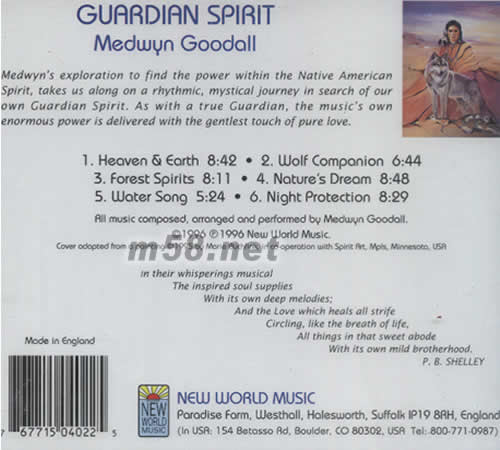 GUARDIAN SPIAIT守護神 新世紀純音樂(m58.net) 繼女巫醫之后,梅德溫踏勘美國去發掘美國土人的精神,新作守護神,以一貫明快、開揚的節奏帶我們走上神秘之旅,發掘潛在守保神,你會發現梅得溫的音樂就是像有一個真正的守護神坐陣,原始、 純真的感覺悟慷慨地源源發放
