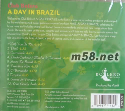 里約情懷(m58.net) 結他手ARMIK一改以往法林明高吉他風格,以結他彈奏出十首巴西BOSSA NOVA風格之熱情樂章,以熱情爽朗的樂風,重新演澤JOBIM名作,悠揚悅耳的旋律令人聞歌起舞。BOLERO發(fā)燒級錄音,結他聲清脆玲瓏,精彩至極。