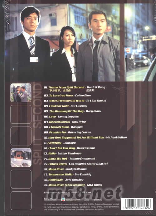 1、Theme from Split Second-Nam Yik Pong 藍(lán)奕邦 2.To Love You More-Celine Dion 3.What A Wonderful World-art Garfunkel 4.Fields of Gold-Eva Cassidy 5.The Dimming of the Day-Mary Black 6.Love-Kenny Loggins 7.Heaven Knows-Rick Price 8.Eternal Flame-Beverly Craven 9.Promise ME-Beverly Craven 10.How Am I Supposed To Live Without You-Michael Bolton 11.Faithfully-Journey 12.I Can't Tell You Why-Brownstone 13.Hello-luther Vandross 14.Since We Met-Tommy Emmanuel 15.Lotus Eaters-Los Angeles Gutar Quartet 16.Moon River-Andy Williams 17.Tennessee Waltz-Eva Cassidy 18.Hallelujah-Jeff Buckley 19.Moon River(Thai Version)-Tata Young