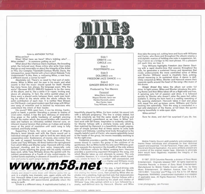 價(jià)格為估,以實(shí)到貨為準(zhǔn)! Miles Smiles 邁爾士的微笑 45轉(zhuǎn) 雙黑膠(m58.net) 60年代末期邁爾士正準(zhǔn)備把融合樂概念推向國(guó)際舞臺(tái),這張專輯提前宣告了這個(gè)偉大理念的來臨。一開始的「Orbit」,除了一慣調(diào)式結(jié)構(gòu)之外,同時(shí)由兩件樂器共同做主題陳示的手法,也添加了樂曲隱念的多重即興風(fēng)格。最精彩的獨(dú)奏,一步一步的引出即興旋律,聽完樂曲只有大呼過癮形容。另一首「Freedom Jazz Dance」,讓你深刻體會(huì)樂手擋不住的即與樂趣,樂手之間快速的互動(dòng)變異,調(diào)性的轉(zhuǎn)移與即興趣味完全顯露無遺,呈現(xiàn)出微笑般的開朗與伸展雙臂的邀請(qǐng)的現(xiàn)代爵士專輯。