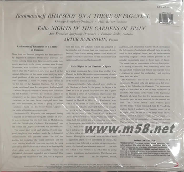 拉赫瑪尼諾夫:帕格尼尼主題狂想曲&法雅:西班牙花園之夜Rhapsody On A Theme Of Paganini & Falla: Nights In The Gardens Of Spain 180g 33RPM LP 黑膠專輯背面圖片
