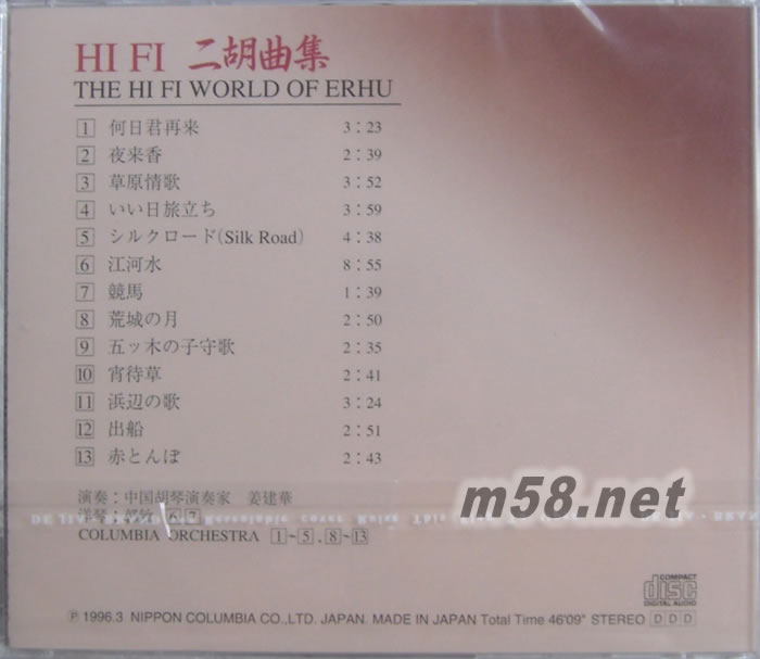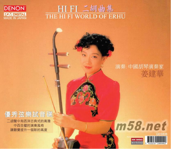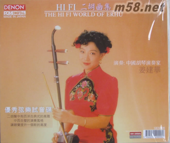 HI FI 二胡曲集 姜建華(m58.net) 日本天龍版優秀 弦樂試音碟 HI FI 二胡曲集 THE HI FI WORLD OF ERHU MADE IN JAPAN 二胡聲中有西洋古典式的高雅 中西合璧的演奏風格 讓聽覺提升一個新的高度 演奏: 中國胡琴演奏家 姜建華 洋琴: 郭敏 姜建華,女,,著名旅日二胡演奏家,國家一級二胡演奏家,民族管弦樂學會常務理事,中央音樂學院教授研究生導師。 1982年獲得全國器樂大賽優秀表演獎。除了精湛的演奏技藝之外,頗具特色演奏風格也讓樂迷們津津樂道。 在演奏曲目上,姜建華大膽地嘗試用二胡演奏西洋曲目,二胡演奏的歌劇圖蘭朵選段《今夜無人入睡》、卡門以及查爾達斯,讓人在二胡的中國化悠揚聲中又領略到了西洋古典式的高雅,中西合璧的演奏風格,把民樂又提升到了一個新的高度。 在演奏形式上,其風格曾被臺灣樂迷戲稱“飆車式”。觀其演出,你或而看其自我陶醉,或而觀其淡定自若,或而跟隨其奔騰歡愉,或而又被其感動地淚染衣巾。她的二胡,賦予了更深的感懷,因此除了要聽,更要去看,只有看了現場,才會深切體會到,二胡,原來也可以這樣貼近我們的生活!